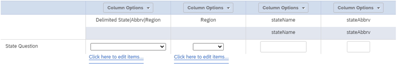 The Side-by-side question will have one row and either 3 or 4 columns depending on whether state abbreviations are included. The first column is a drop-down with delimited states/regions as choices. The choices are either in the format state|region (e.g., Alabama|South) or state|abbreviation|region (e.g., Alabama|AL|South). The second column is a drop-down with the regions as choices. The region names must match the region names used in the first column. The third column is a text entry field for the state name. The fourth column is a text entry field for the state abbreviation and is only needed if the delimited choices in the first column include abbreviation. It will look something like this in the Qualtrics editor: